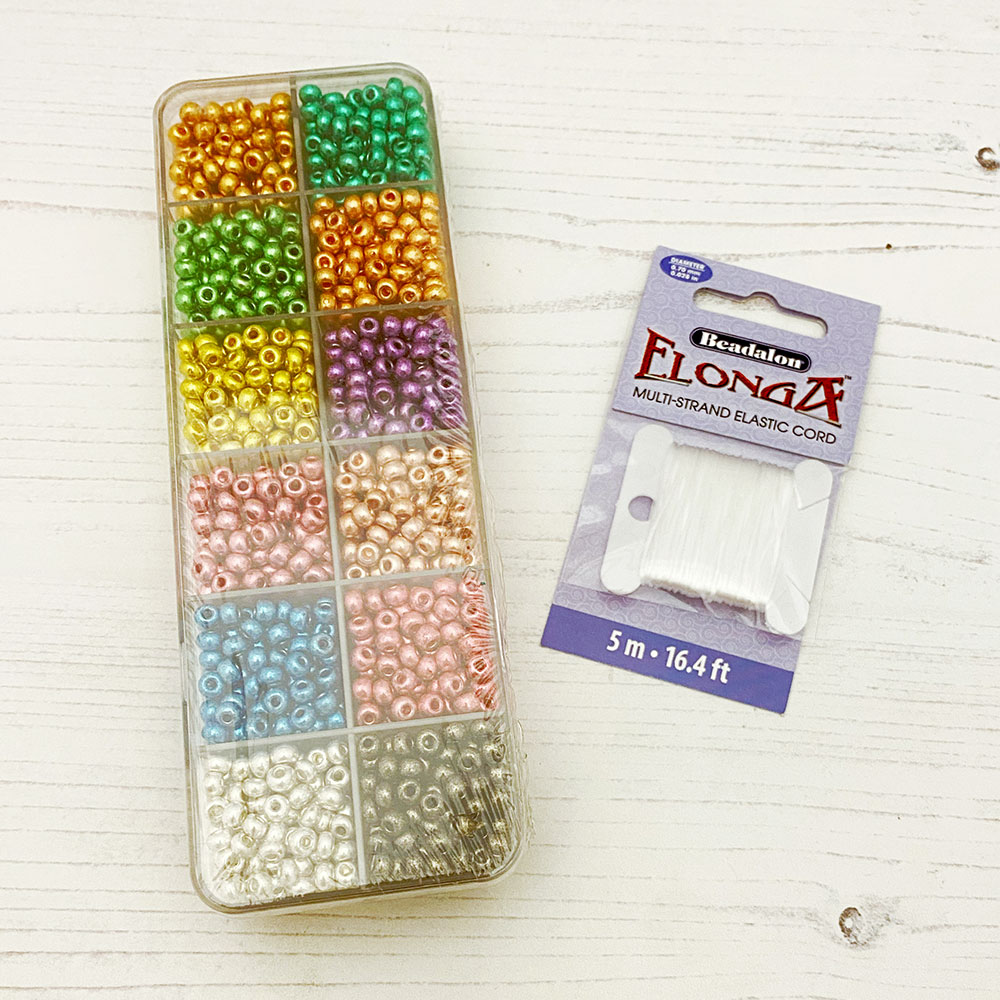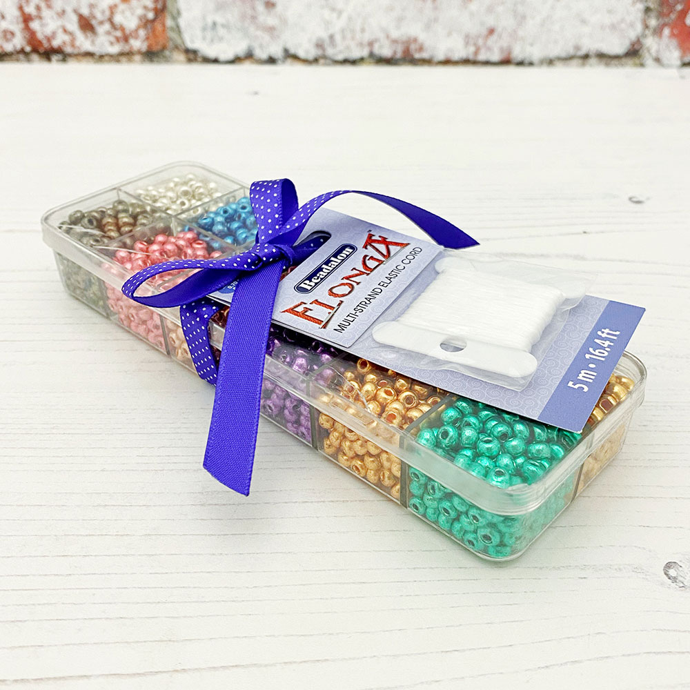 This seed bead jewellery making kit comes complete with a reusable storage box of 10 colours of size 5 Czech Glass seed beads. As well as 5m of Elonga elastic, which is enough to make 15 – 20 bracelets!