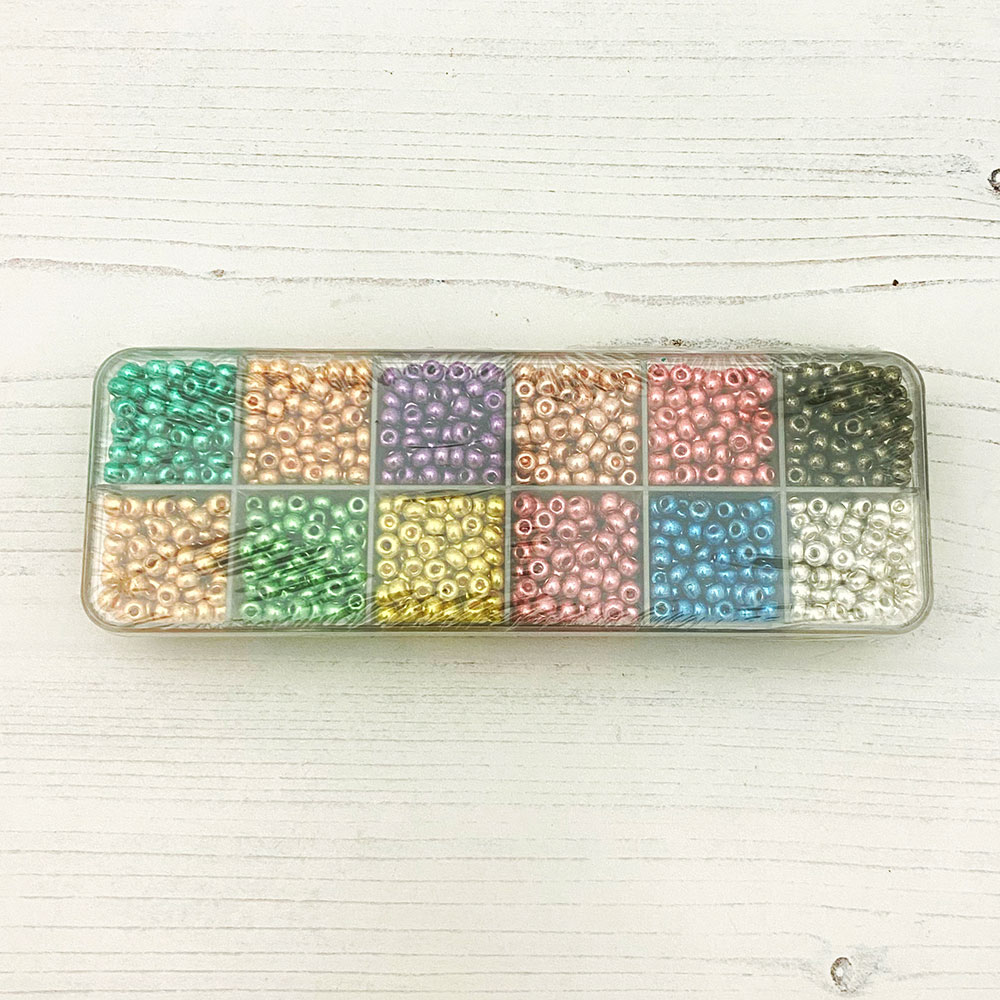 The box measures 15.5cm long, 5.5cm wide and 2cm deep. It contains 12 different colours in similar metallic effects. There’s approximately 24g (175 beads) of each colour. Making a total of approximately 288g.